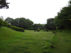 中央奥ちょい右辺りで土塁に区切られているのが厩跡らしい