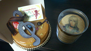 ケーキの方は、これ買ってから寄り道したせいでドライアイスがとけ、チョコ板に描かれた音符が滲んでしまった・・・・゚(つД`)・゚・